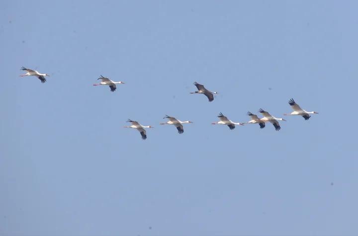 记者了解到,北京地区共分散七种鹤类,分离是白枕鹤、灰鹤、白头鹤、白鹤、丹顶鹤、蓑羽鹤和沙丘鹤。比年来,体型优雅的白鹤频频在北京现身。2022年3月,17只白鹤在南海子公园上空翱翔。2023年3月,5只白鹤曾在密云水库北岸落脚歇息。
